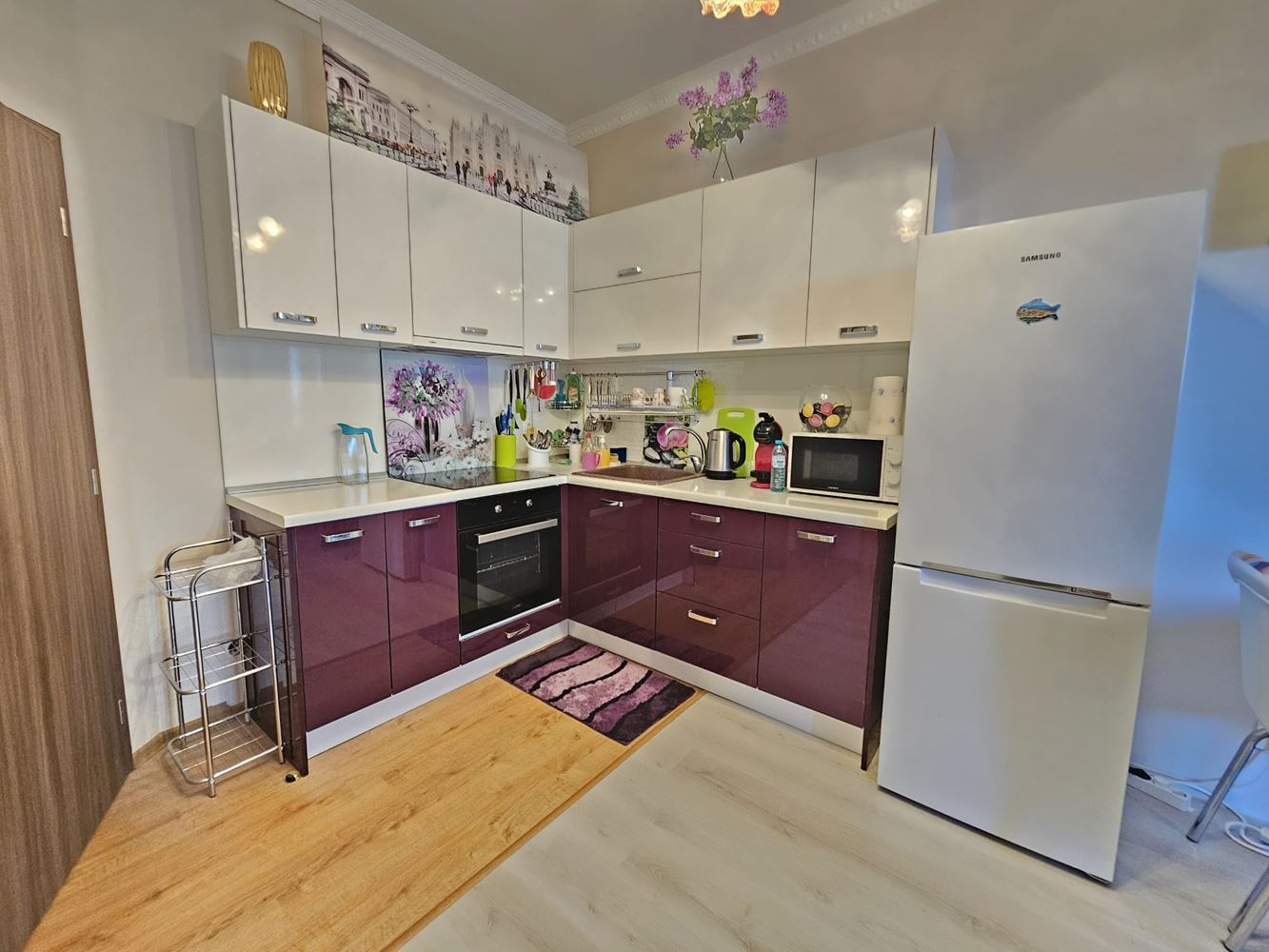 Квартира имеет функциональную планировку: просторная гостиная с кухонным блоком и обеденной зоной, отдельная спальня, ванная с туалетом и балкон для отдыха на свежем воздухе. Большие окна обеспечивают обилие естественного света и приятные виды, а высокий 9 этаж гарантирует тишину и приватность.