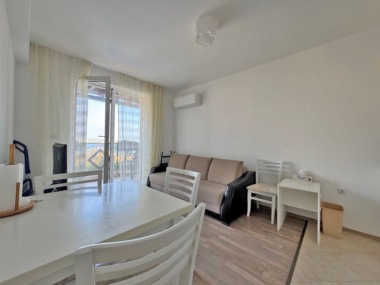 Квартира функционально распределена и предлагает комфортную жилую среду: входной коридор, светлая гостиная с местом для кухонного блока и обеденной зоны, отдельная спальня, ванная комната с туалетом и один уютный балкон. С балкона открывается потрясающий вид на море — идеальное место для утреннего кофе или вечернего отдыха. Недвижимость находится в здании с лифтом, который обеспечивает лёгкий и удобный доступ к жилью. Общие части поддерживаются в хорошем состоянии, а близость к пляжу делает квартиру подходящей как для личного пользования, так и для прибыльной инвестиции для краткосрочной или долгосрочной аренды.