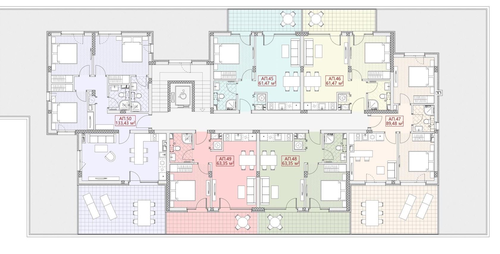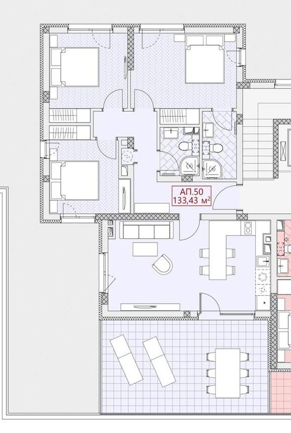 Квартира расположена на шестом этаже и имеет общую площадь 133,43 м², обеспечивающую простор и функциональность. Входная зона создает ощущение хорошо организованного пространства с самого входа и ведет к светлой и просторной гостиной с отдельной кухонной зоной, спроектированной так, чтобы обеспечить максимальный комфорт как в повседневной жизни, так и при приеме гостей. Большие окна способствуют обилию естественного света и ощущению воздуха и простора. Три спальни являются отдельными, правильной формы и имеют возможность полноценного обустройства, что делает их подходящими как для семьи, так и для использования в качестве гостевой комнаты или кабинета. Две ванные комнаты с туалетом оформлены в современном стиле, а просторная панорамная терраса предлагает приятное место для отдыха, утреннего кофе или вечернего расслабления после долгого дня.