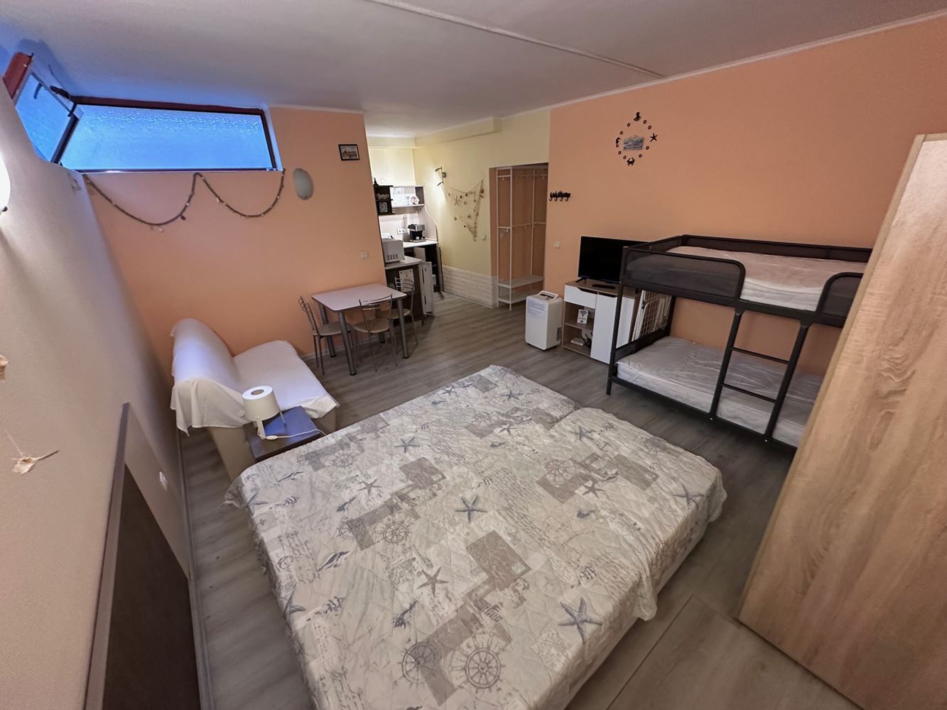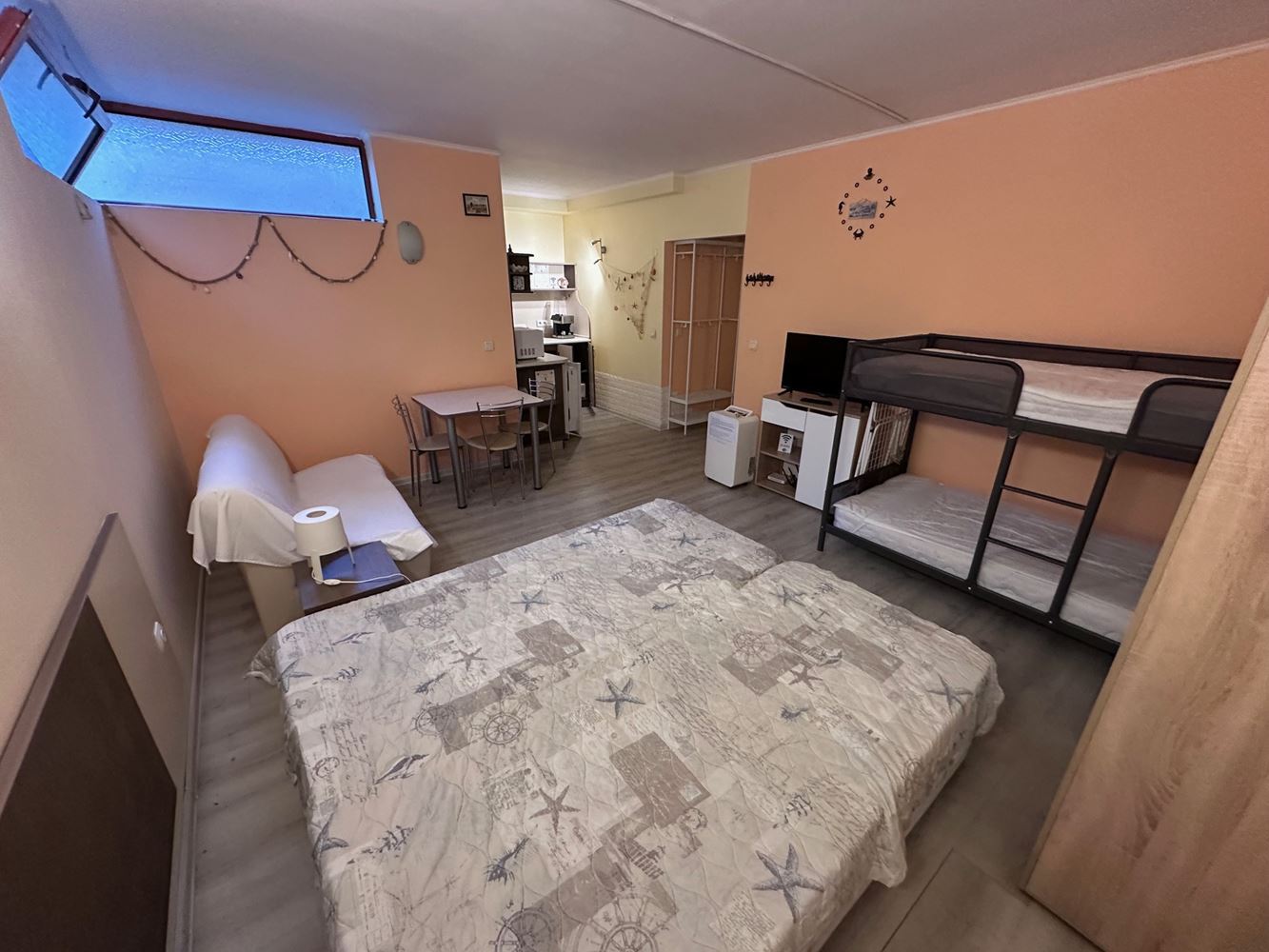 Студия включает прихожую, кладовку, санузел (ванная с WC), просторную гостиную с кухонным боксом, обеденной зоной и обособленной спальней. В спальне — французский матрас, а двухъярусная кровать обеспечивает дополнительный комфорт для семей с детьми. Каждая зона жилья продумана и создает уютную атмосфеpу.