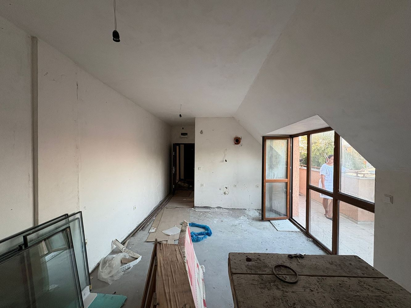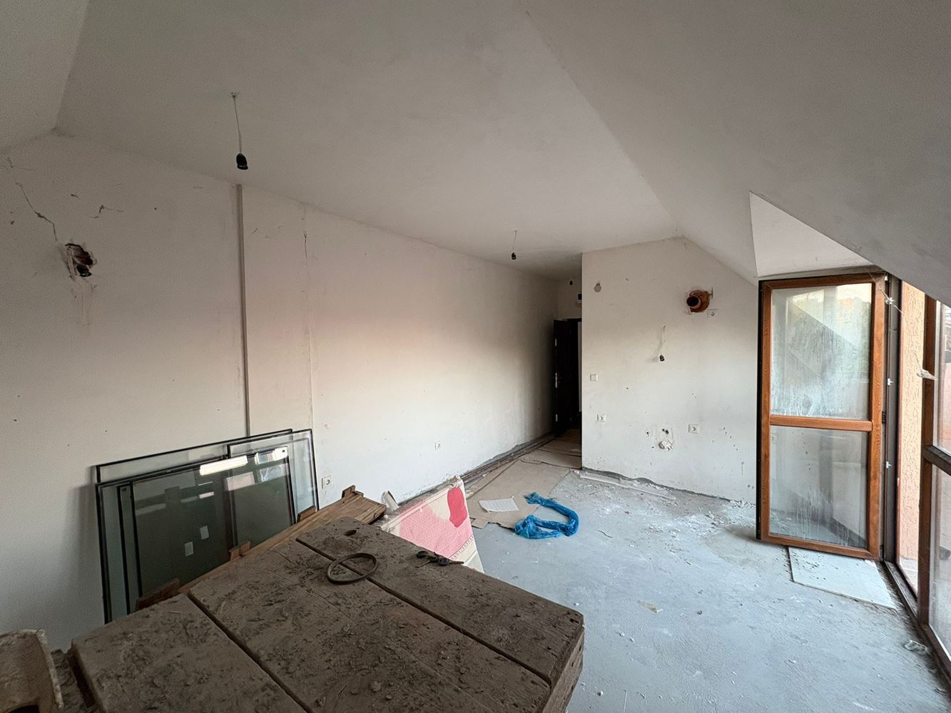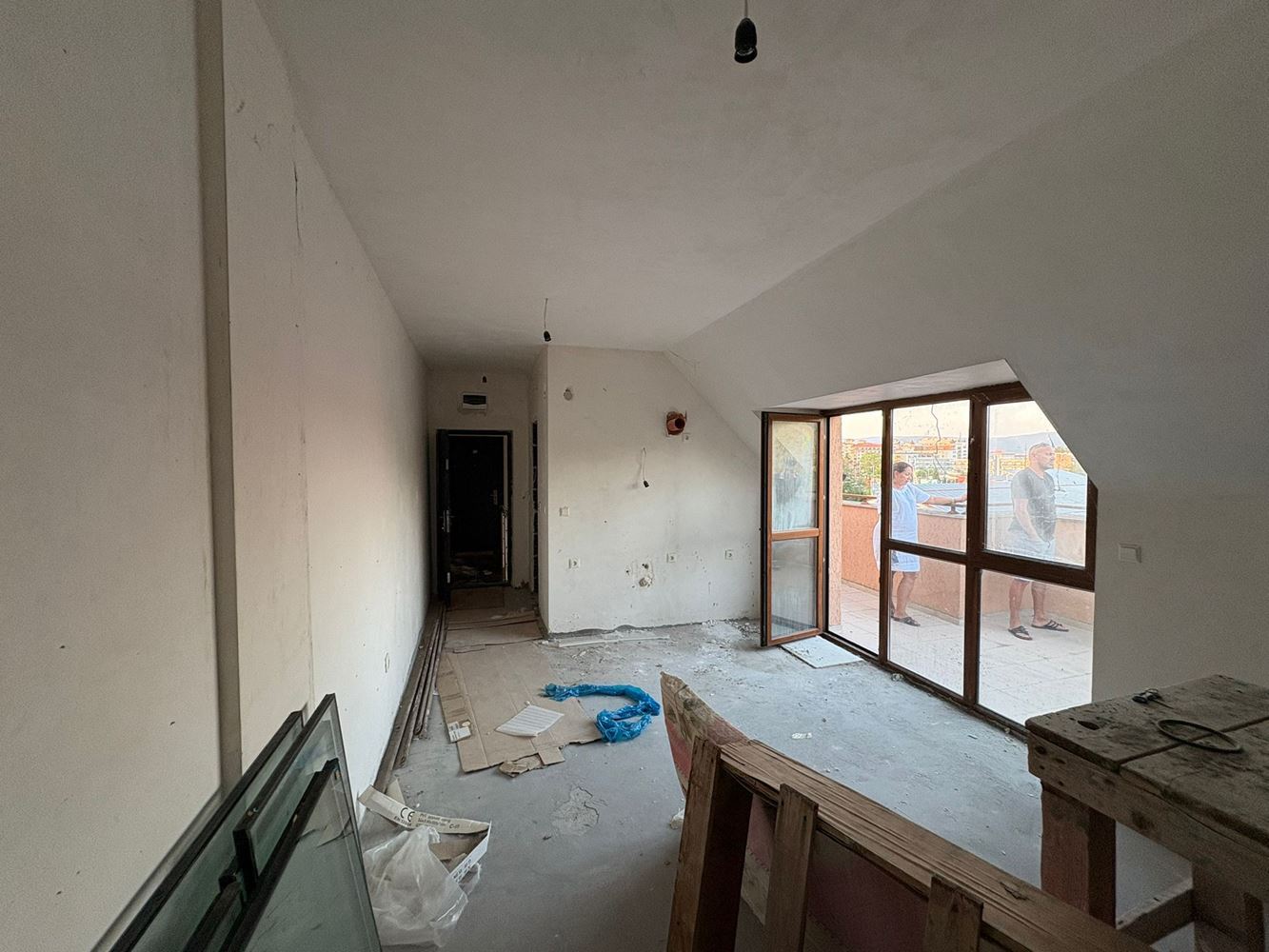 Общая площадь 47 м². Планировка практичная и удобная: прихожая, просторная жилая зона с кухней и местом для спальни, ванная комната с туалетом, а также две открытые террасы/балконы, создающие приятные зоны для отдыха на свежем воздухе. Ориентация на восток/юг обеспечивает много естественного света в течение дня. На последнем этаже есть лёгкие скосы, придающие характер помещению и позволяющие реализовать креативные интерьерные решения. Состояние «на тапа» даёт возможность оформить жильё по вашему вкусу – от напольных покрытий и освещения до кухни и сантехники. В здании нет лифта, что отражено в привлекательной цене и низких текущих расходах на содержание.