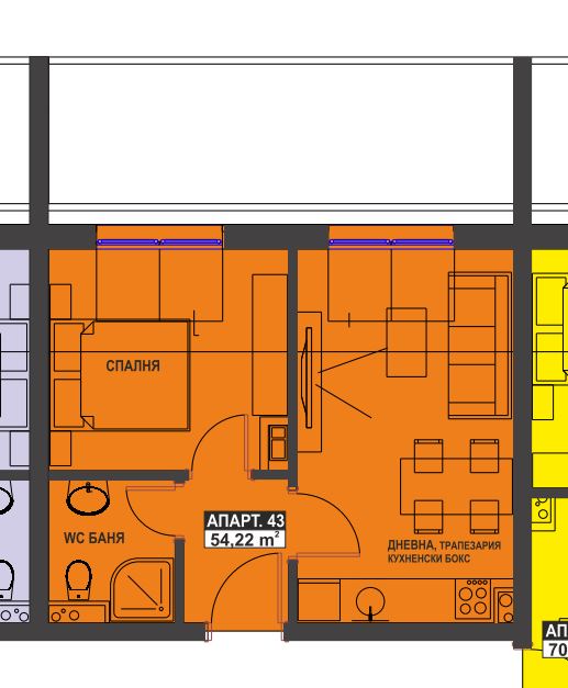 Новая двухкомнатная квартира в жилом здании в городе Бургас, в пешей доступности от моря. Квартира расположена на последнем седьмом этаже, а ее площадь составляет 54,22 м2. Состоит из прихожей, холла с кухонной частью, спальни и ванной комнаты с WC. В подвальном этаже имеется кладовка. Квартиры в доме спроектированы так, чтобы было удобно и светло. Архитектура здания современная, по европейским стандартам. Планируется озеленение около участка. Квартира продается без мебели и отделки. Жилой комплекс будет без платы за обслуживание общих частей.