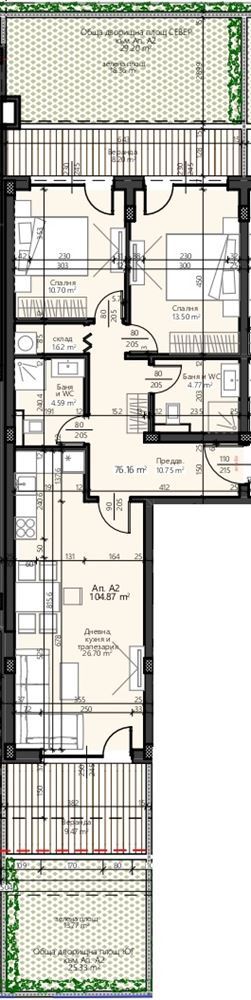 Квартира впечатляет общей площадью 147,13 м² на первом этаже и удобной планировкой: кухня – гостиная – столовая, две отдельные спальни, две ванные комнаты с WC, кладовая, коридор, а также две веранды с прилегающим двором – идеальное место для утреннего кофе, семейных обедов или спокойных вечеров на свежем воздухе. Два открытых пространства создают ощущение дома в городской среде – настоящий бонус в нескольких шагах от моря.
