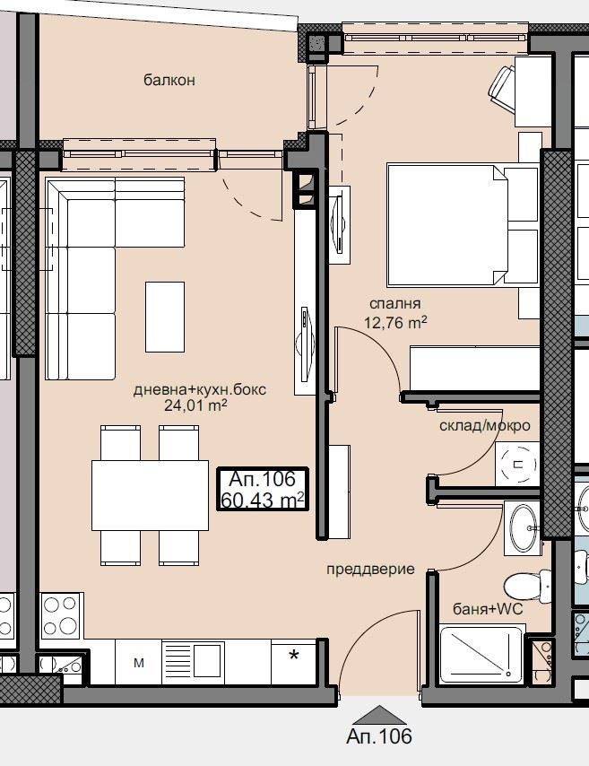 Жильё состоит из гостиной с кухонной зоной, уютной спальни, ванной с туалетом, кладовой/постирочной и коридора. Особое удобство представляет терраса с выходом из обеих комнат, обеспечивающая дополнительный свет и место для отдыха на открытом воздухе. Квартира продается по стандарту БДС, на чистовую отделку, что позволяет владельцу завершить интерьер по собственному вкусу.