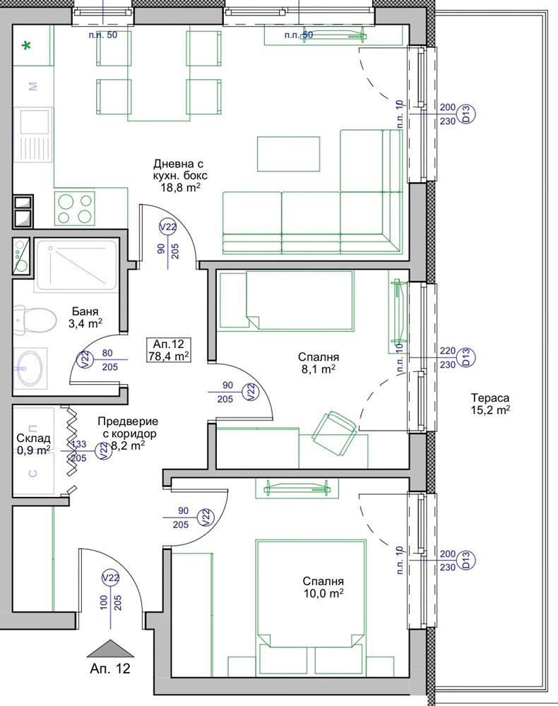 Квартира имеет функциональную и удобную планировку: прихожая, просторная гостиная с кухней, две отдельные спальни, ванная комната с туалетом, кладовая и большая терраса. Все три комнаты имеют прямой выход на террасу – прекрасное место для утреннего кофе, дневного отдыха или ужина на свежем воздухе. Интерьер сбалансирован, обеспечивая комфорт и приватность для каждого члена семьи. Квартира продаётся в состоянии «под отделку», что даёт возможность выбрать собственный стиль отделки и создать дом по своему вкусу. В здании будет лифт для максимального удобства.