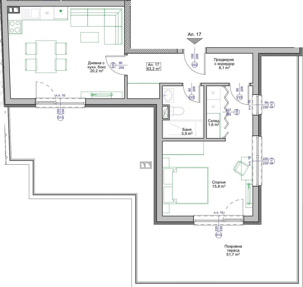Квартира общей площадью 128,89 м² имеет функциональную планировку: просторная гостиная с кухонной зоной и выходом на огромную террасу, отдельная спальня с выходом на террасу, ванная комната с туалетом, кладовая и удобная прихожая. Квартира продаётся «под отделку», что даёт возможность реализовать свой индивидуальный стиль и стандарты. В доме есть лифт, а предусмотренные гаражи и парковочные места обеспечивают удобство для парковки.