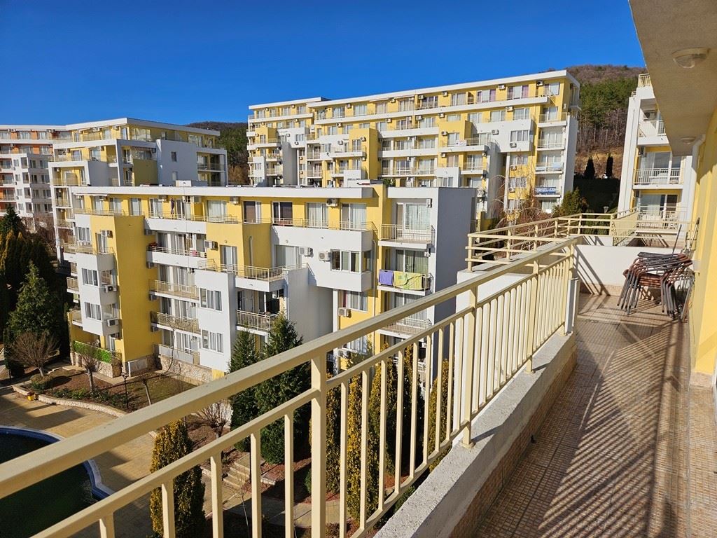 Представляем исключительно привлекательную двухкомнатную квартиру с впечатляющим панорамным видом на море и бассейн, расположенную в утвердившемся и популярном комплексе между курортами Святой Влас и Елените. Общая площадь недвижимости составляет 85 m², квартира находится на шестом этаже, что гарантирует простор, тишину и уникальную 180-градусную панораму, раскрывающую красоту Чёрного моря и зелёных территорий комплекса.