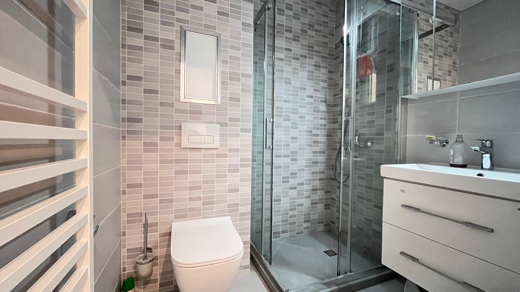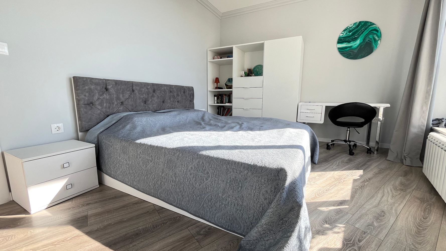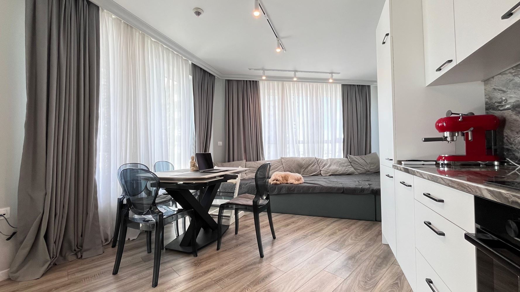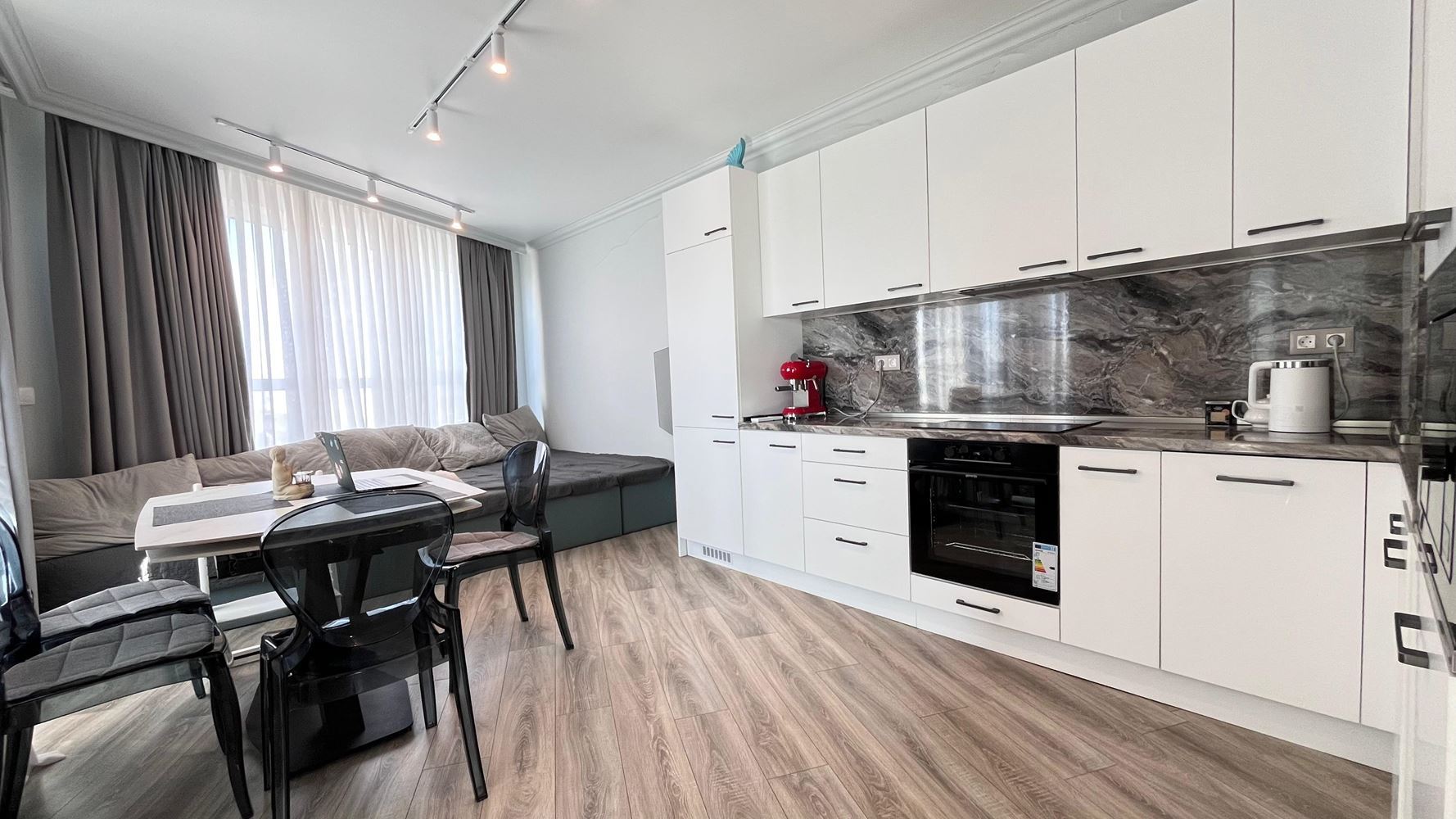 Функциональная планировка включает светлую гостиную с местом для кухонного уголка и столовой, уютную спальню, одну ванную комнату с туалетом и удобный балкон – идеально для утреннего кофе или вечернего отдыха. Большие окна и высокий этаж обеспечивают обилие естественного света в течение дня и подчеркивают панорамный характер квартиры.