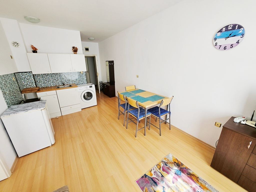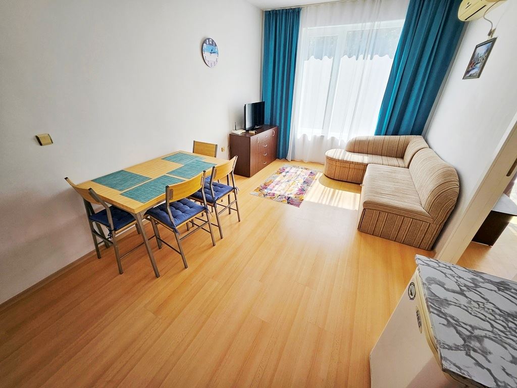 Предлагаем прекрасную двухкомнатную квартиру площадью 50 м², расположенную в современном комплексе в курорте Солнечный берег. Недвижимость сочетает комфорт, функциональную планировку и привлекательную среду — отличный выбор как для личного отдыха, так и в качестве инвестиции с хорошим арендным потенциалом. Квартира включает уютную гостиную с кухонным уголком и обеденной зоной, отдельную спальню, практичную ванную комнату с туалетом и балкон, идеально подходящий для утреннего кофе или отдыха на свежем воздухе. Большие окна наполняют помещение естественным светом.