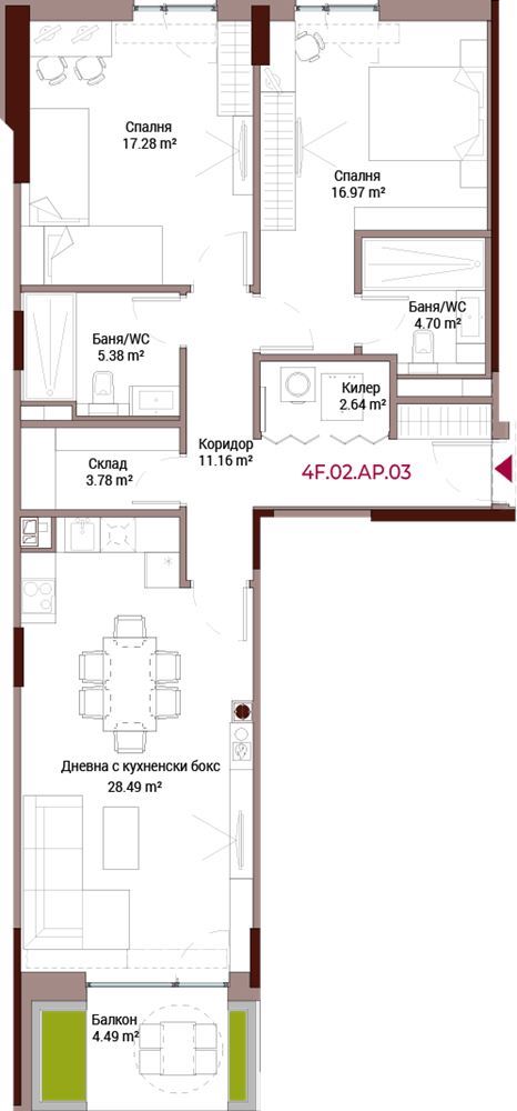 Откройте для себя идеальное сочетание элегантности, комфорта и современных технологий с этой трехкомнатной квартирой на 2-м этаже, общей застроенной площадью 111,72 м², общей площадью 142,29 м² и с озелененными террасами общей площадью 157,53 м². Квартира включает приветственный коридор, светлую гостиную с выходом на террасу, две спальни, две ванные комнаты, кладовую и хозяйственное помещение, все оформлено с неподвластной времени изысканностью, вдохновленной знаковой архитектурой Софии.