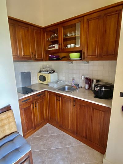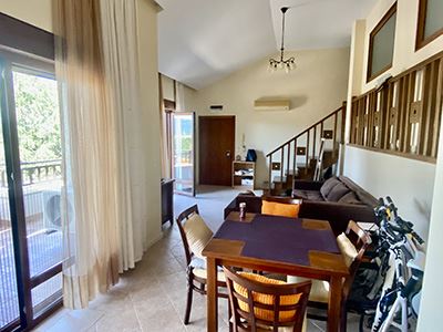 На первом уровне расположена светлая и просторная гостиная с кухней, с выходом на большую террасу с впечатляющим панорамным видом на море и горы. Это пространство идеально подходит для отдыха, утреннего кофе или спокойных вечерних моментов на природе.