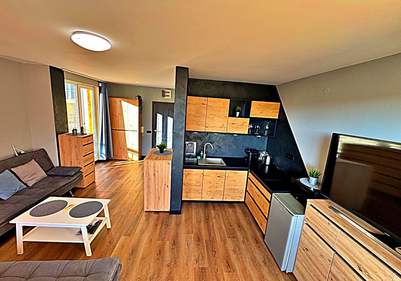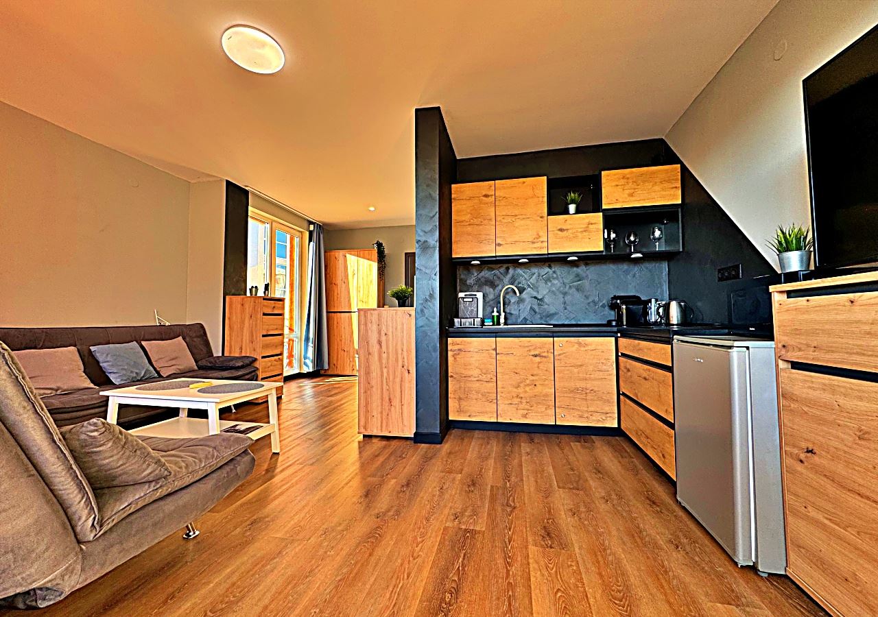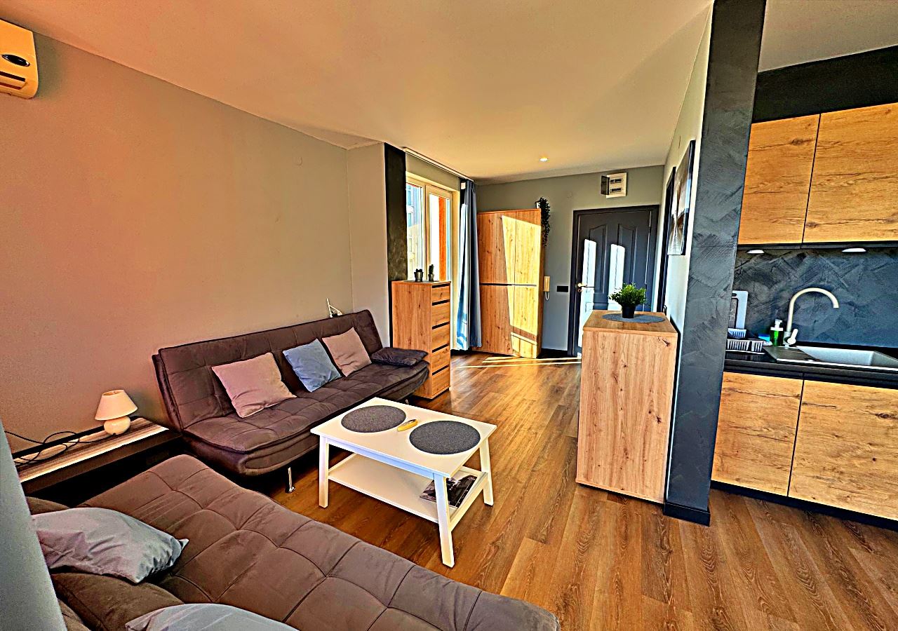 Студия светлая, просторная и функционально организованная, включает зону отдыха, обособленный кухонный уголок и обеденную зону. Мебель подобрана с акцентом на комфорт и практичность, создавая уютную атмосферу для круглогодичного проживания.