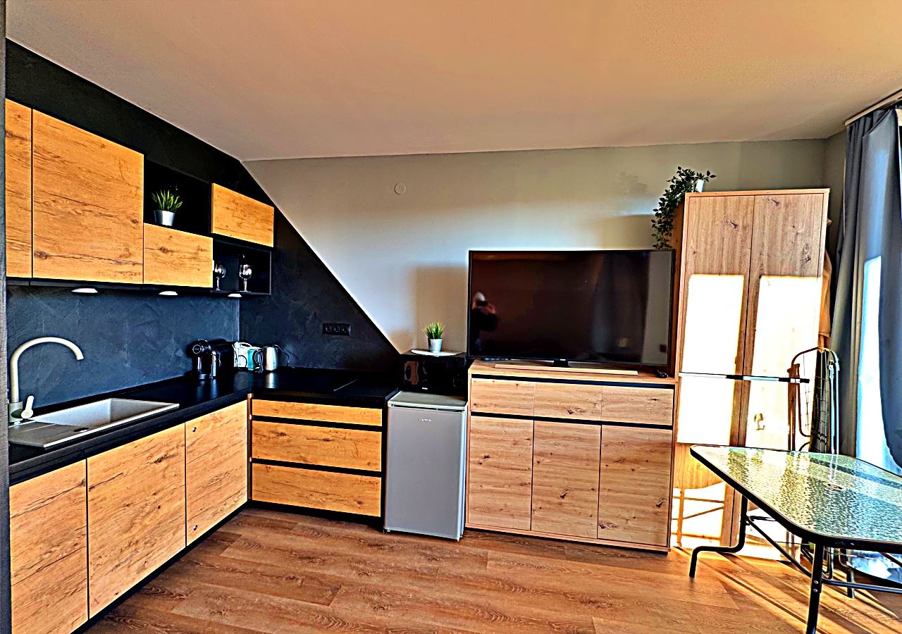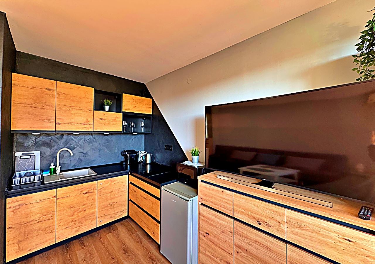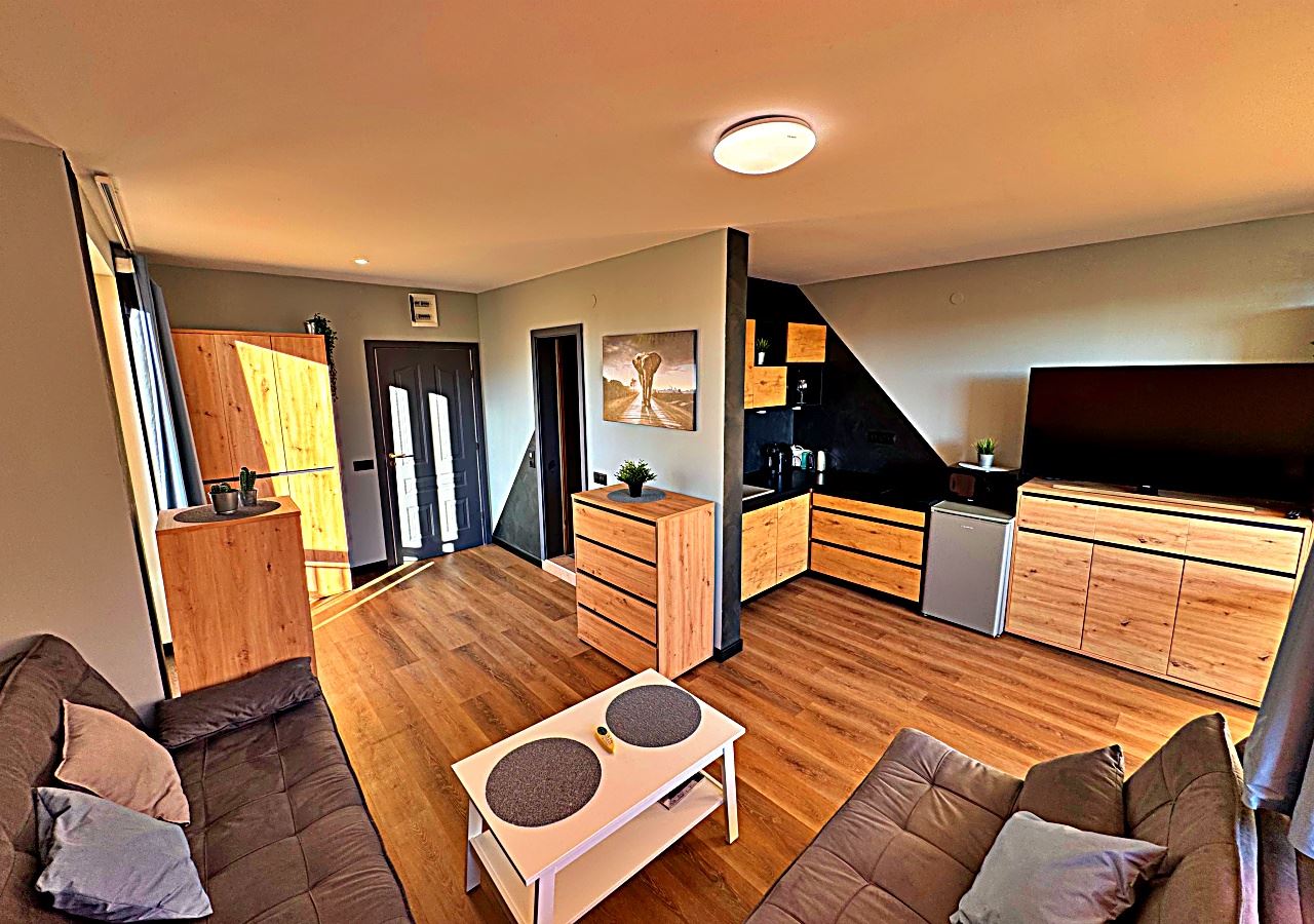 Студия светлая, просторная и функционально организованная, включает зону отдыха, обособленный кухонный уголок и обеденную зону. Мебель подобрана с акцентом на комфорт и практичность, создавая уютную атмосферу для круглогодичного проживания.
