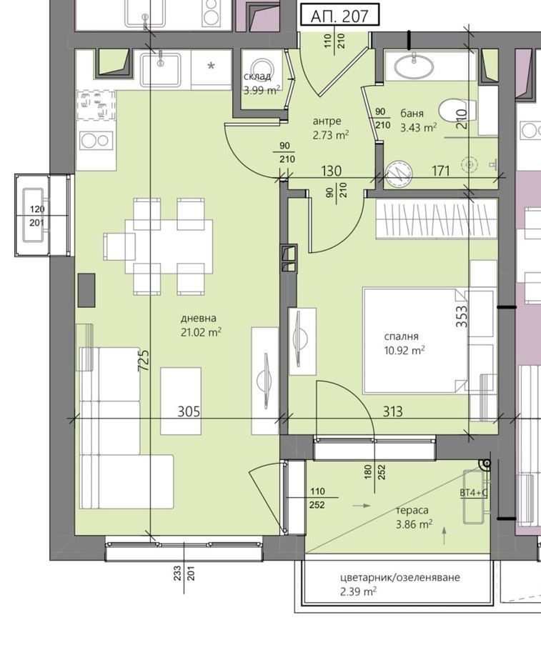 Жильё впечатляет продуманной планировкой – гостиная с кухонным блоком, уютная спальня, ванная комната и балкон, предоставляющий приятное место для отдыха и свежего воздуха. Светлые и просторные помещения создают ощущение простора и комфорта, а интерьер выполнен с использованием современных материалов и элегантных деталей, что придаёт законченный и стильный вид.