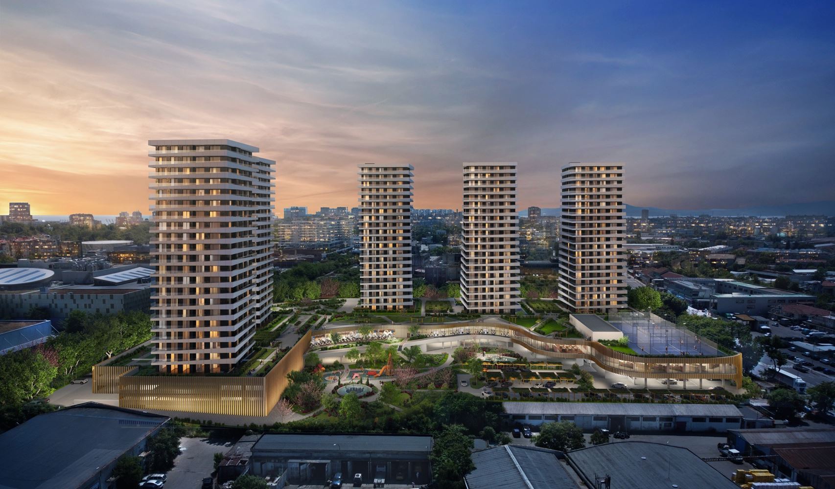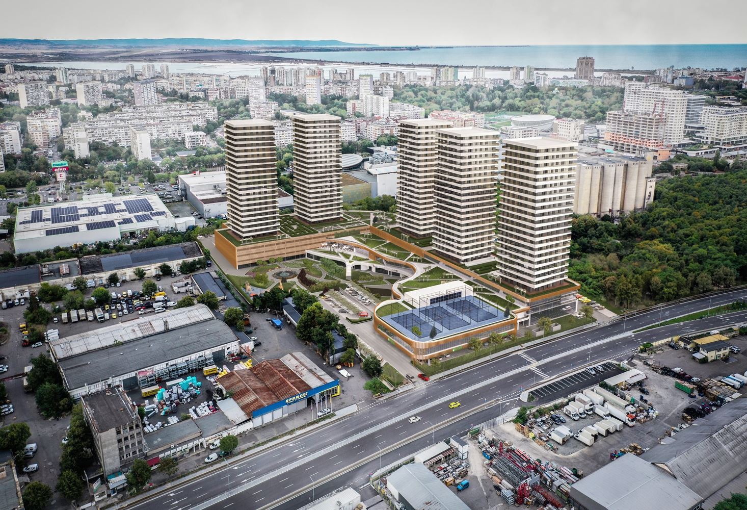 Комплекс включает пять элегантных многоэтажных зданий, уникальных для Болгарии. Их архитектура, высота и современный дизайн максимально сохраняют зелёные зоны, создавая идеальный баланс между природой, открытым пространством и городской средой. Панорамные виды на Чёрное море и озеро Вая создают ощущение свободы и высокого качества жизни.