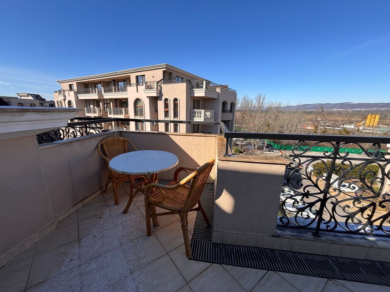 Предлагаем на продажу полностью меблированную и оборудованную студию с просторной панорамной террасой, расположенную на пятом этаже в роскошном комплексе в тихой и спокойной части Солнечного Берега. Общая площадь недвижимости составляет 52,05 м² и предлагает идеальный баланс между комфортом, функциональностью и курортной атмосферой, что делает её отличным выбором как для личного пользования, так и для инвестиций с потенциалом сдачи в аренду. Интерьер выполнен с вниманием к деталям и включает светлую гостиную зону с кухонным уголком, спальную зону и обеденное пространство, создающие ощущение простора и уюта. Квартира продаётся полностью меблированной и оборудованной, готовой к немедленному заселению без необходимости дополнительных вложений. Настоящим акцентом является панорамная терраса, предлагающая приятное пространство для отдыха, утреннего кофе или вечернего расслабления с видом на окрестности.