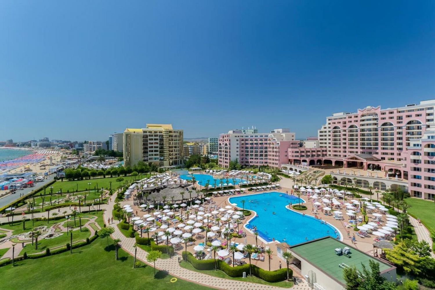Комплекс является одним из самых престижных и масштабных в Солнечном Береге и предлагает богатый выбор первоклассных удобств, созданных для полноценного отдыха, спорта, развлечений и бизнеса. Просторный сад перед зданием красиво озеленен и располагает двумя большими бассейнами, баром у бассейна и отдельным детским бассейном, создавая курортную атмосферу на протяжении всего сезона.