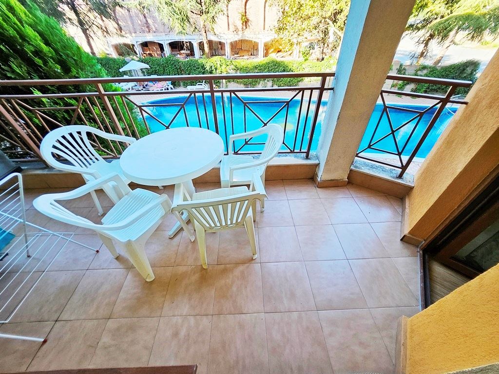 Балкон квартиры предлагает красивый вид на бассейн и окрестности, где можно наслаждаться прекрасными пейзажами.