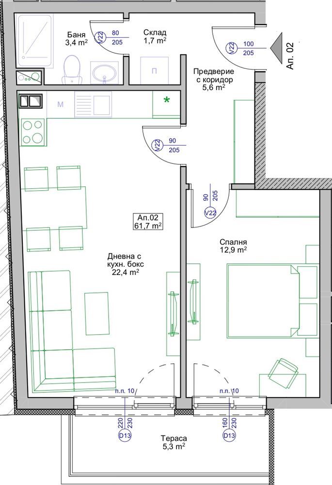 Квартира впечатляет функциональной и удобной планировкой: прихожая, просторная гостиная с кухонной зоной, отдельная спальня, ванная с туалетом, кладовка и одна терраса – идеальное место для утреннего кофе или вечернего отдыха. Компактная и логичная планировка обеспечивает ощущение пространства и легкость организации интерьера. Квартира будет сдаваться по болгарским строительным стандартам (BDS) с вниманием к деталям и качественными материалами, что позволяет новым владельцам реализовать индивидуальный дизайн и обустройство. Здание имеет современную архитектуру и представительные общие зоны, а наличие лифта обеспечивает удобство в повседневной жизни.