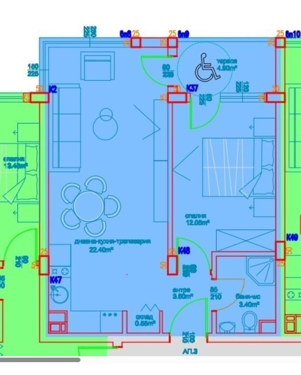 Квартира имеет общую площадь 59,66 m² и предлагает отличную планировку, позволяющую эффективно использовать пространство. Жилье включает входной холл, светлую гостиную с обособленной зоной кухни и обеденным уголком, уютную спальню, ванную комнату с туалетом и один балкон, с выходом из обеих основных комнат, обеспечивающий дополнительное естественное освещение и ощущение простора.