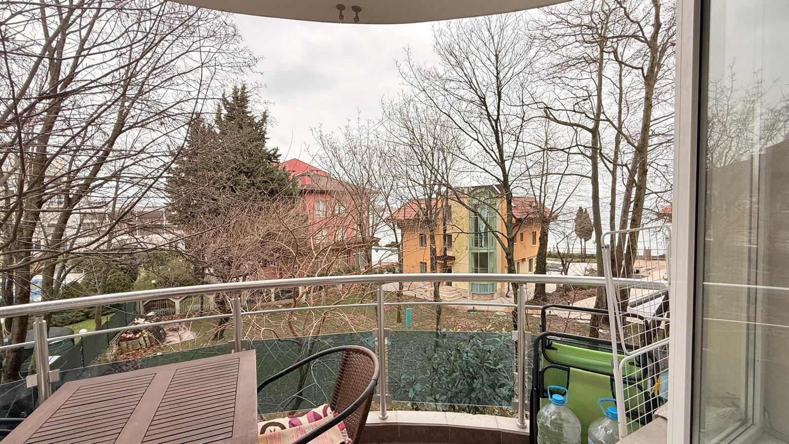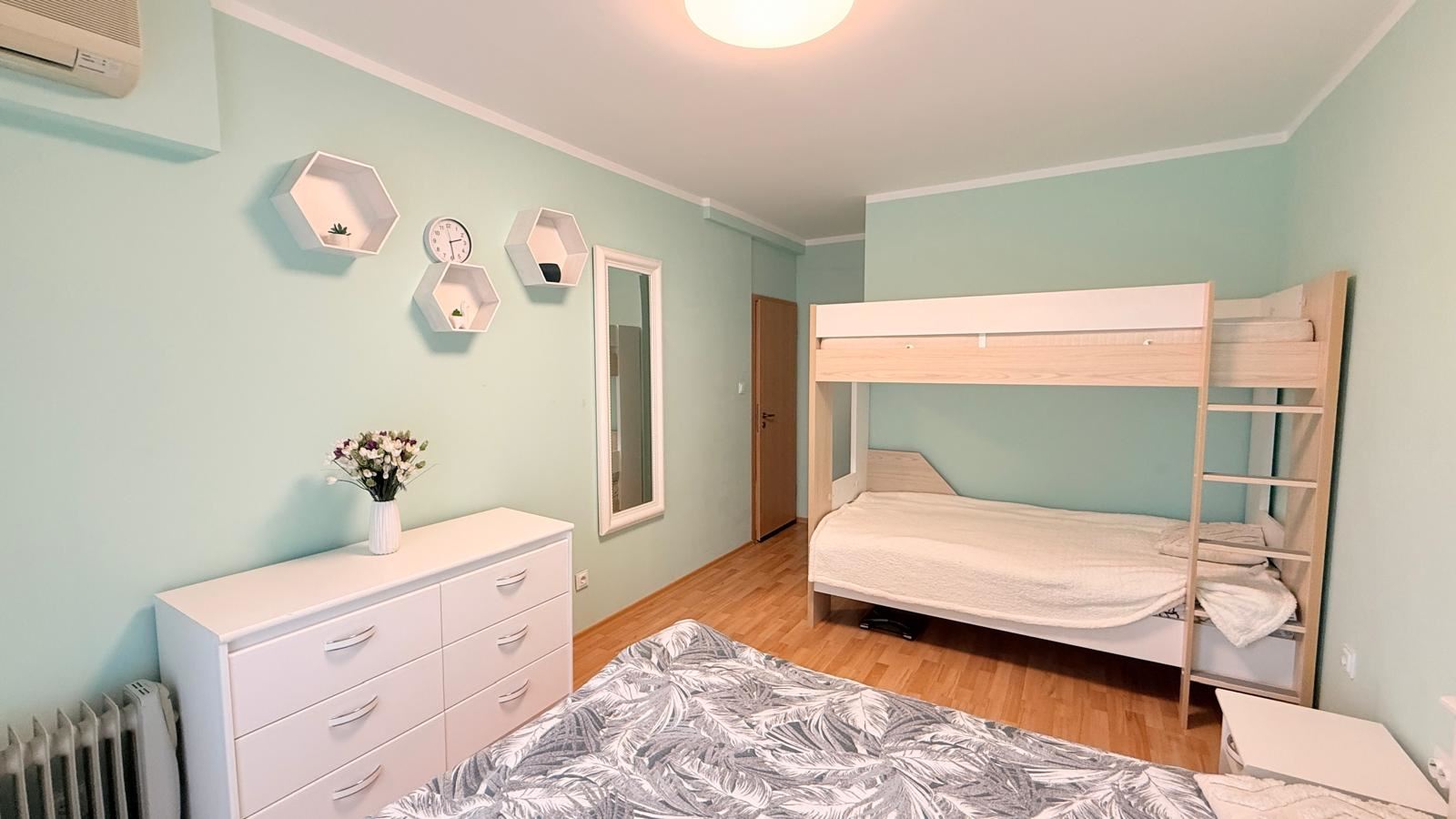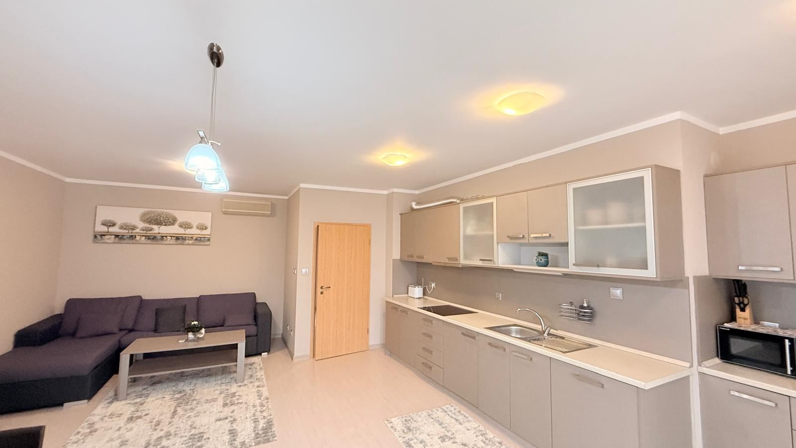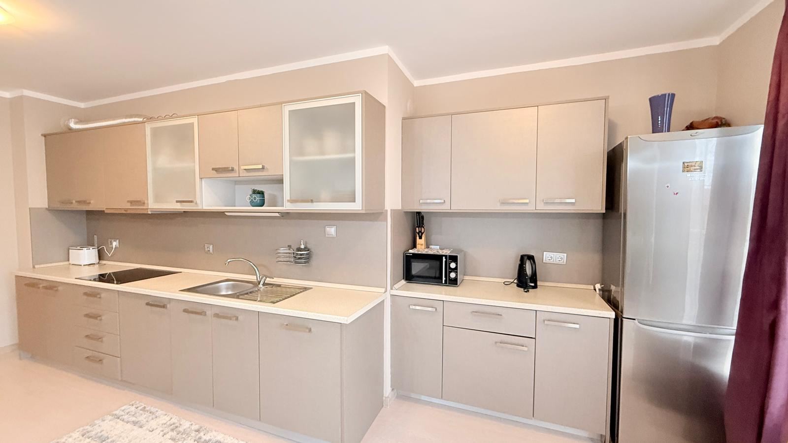 Квартира впечатляет функциональной и комфортной планировкой, созданной с учетом потребностей современной семьи. Просторная гостиная с кухней светлая и уютная, с полностью новой современной кухней, оснащенной совершенно новой бытовой техникой, а также стильной мебелью, подобранной с вниманием к деталям. Из гостиной открывается красивая панорама на море, создающая ощущение простора и спокойствия.