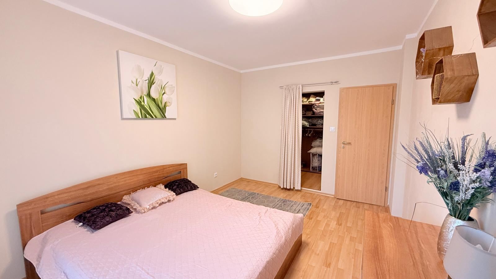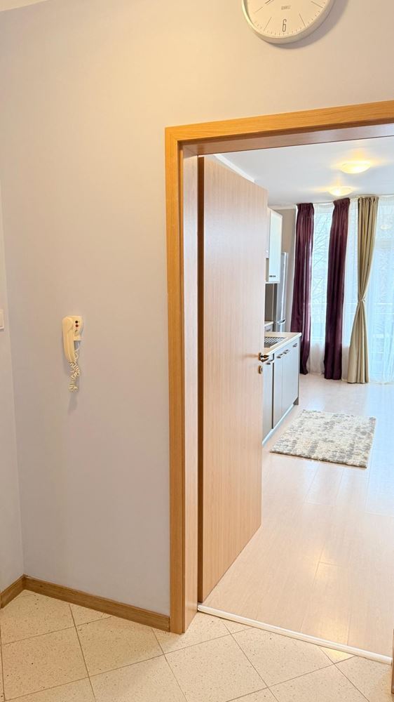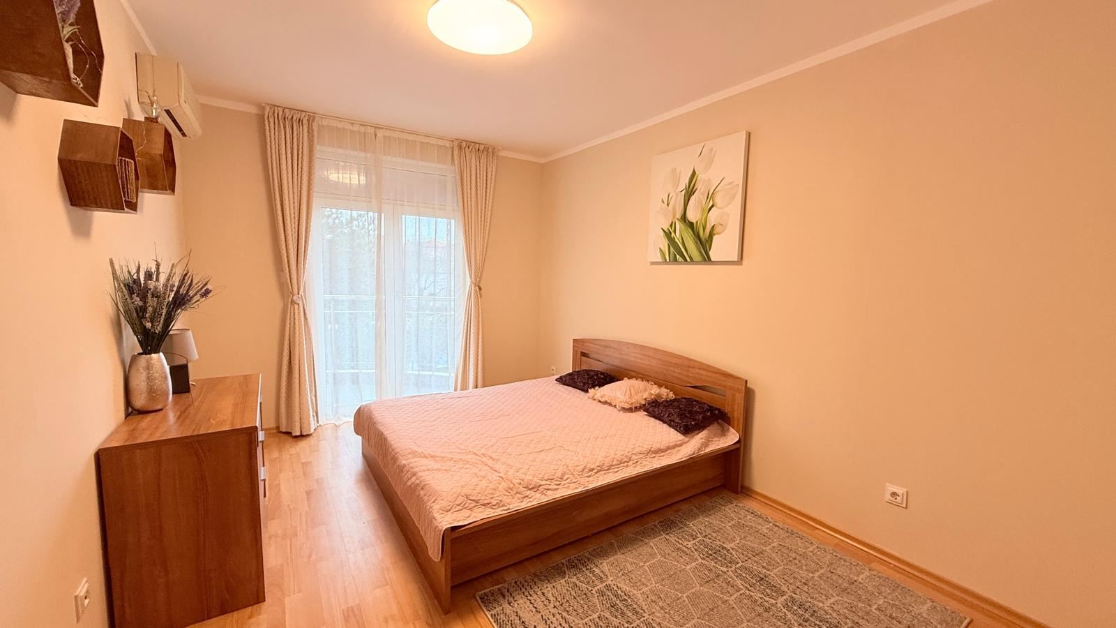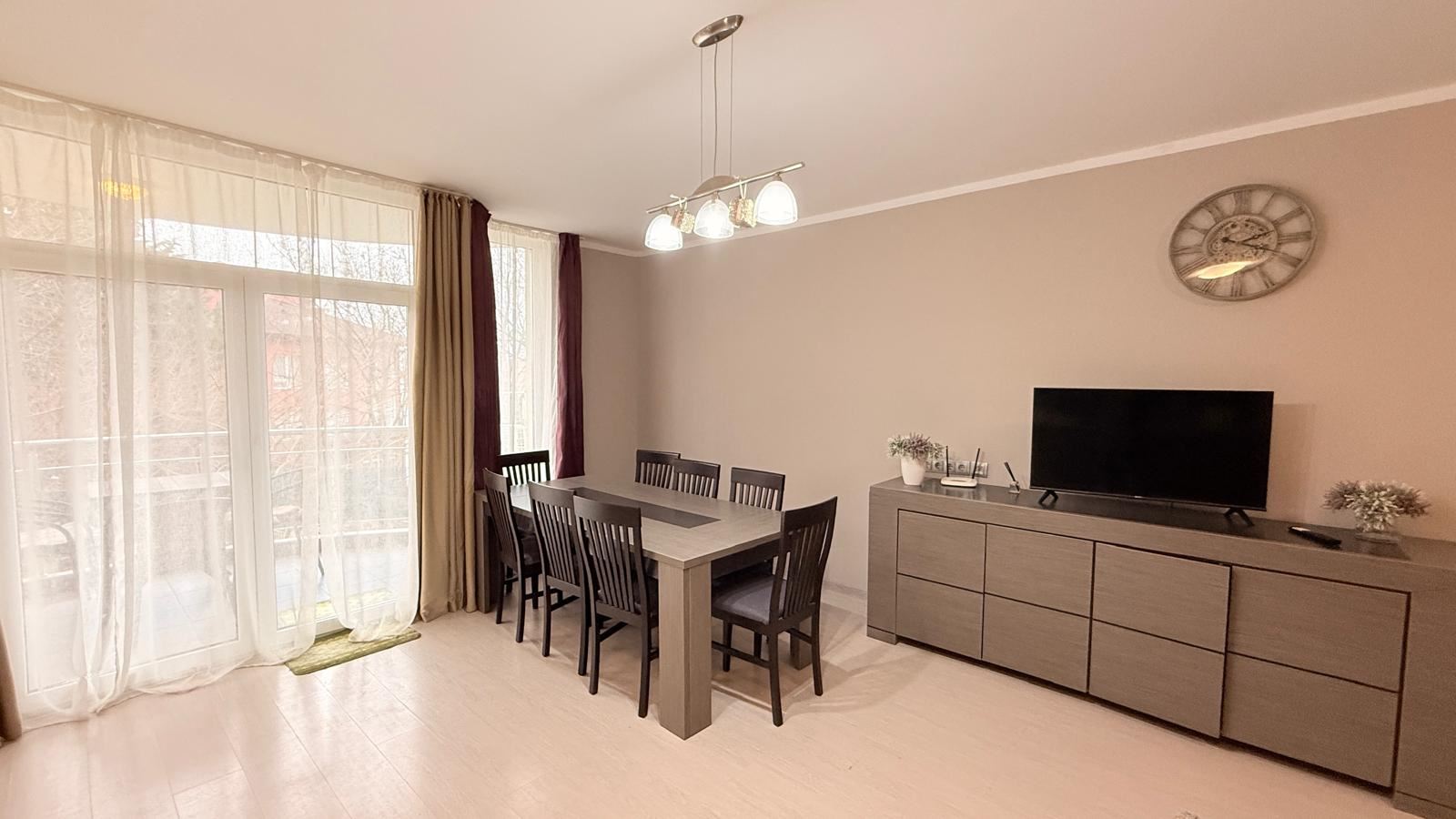 Квартира впечатляет функциональной и комфортной планировкой, созданной с учетом потребностей современной семьи. Просторная гостиная с кухней светлая и уютная, с полностью новой современной кухней, оснащенной совершенно новой бытовой техникой, а также стильной мебелью, подобранной с вниманием к деталям. Из гостиной открывается красивая панорама на море, создающая ощущение простора и спокойствия.