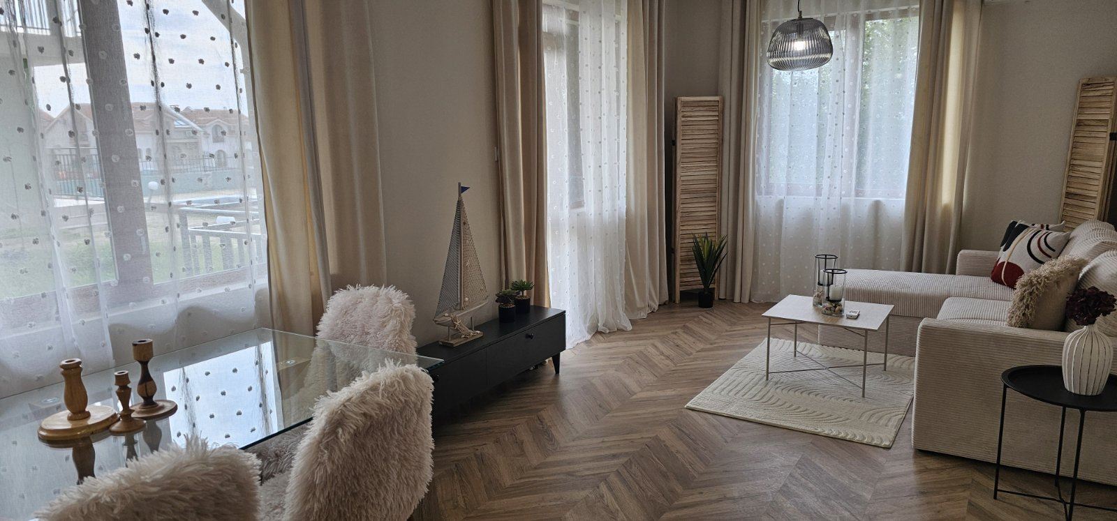 Предлагаем на продажу стильную трёхкомнатную квартиру на высоком первом этаже в Солнечном Берегу, общей площадью 87 м², полностью обновлённую после дизайнерского ремонта и готовую к заселению. Недвижимость без таксы поддержки, с Актом 16 и отдельными счетами за электричество и воду – идеальный вариант как для круглогодичного проживания, так и для инвестиций.