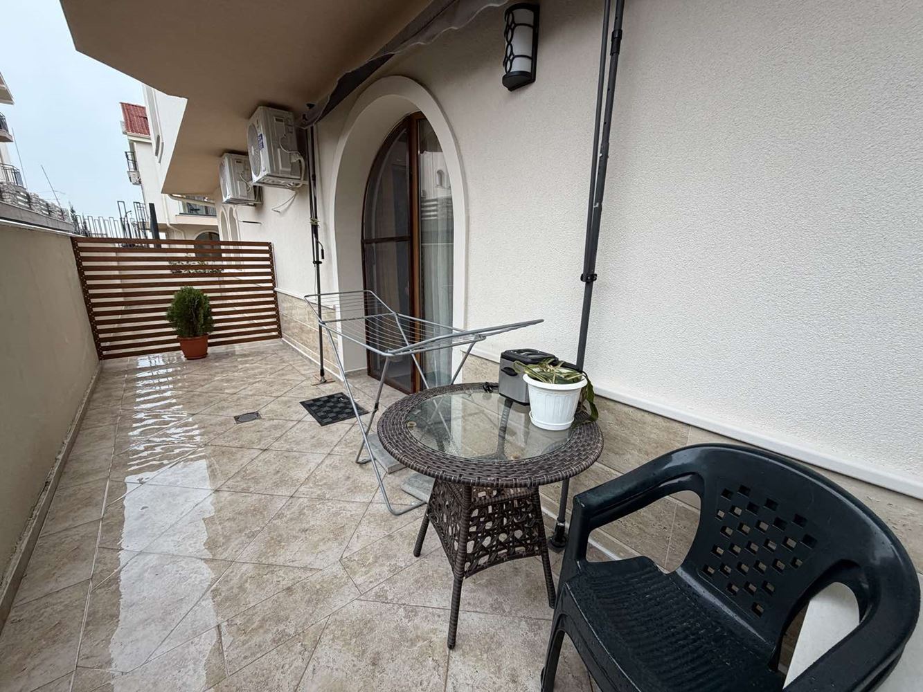 Квартира имеет функциональную планировку, включающую светлую гостиную зону, спальню, отдельный туалет и ванную комнату с туалетом, что обеспечивает удобство в повседневной жизни. Одним из главных преимуществ объекта является большая терраса, предлагающая дополнительное пространство для отдыха, приёма пищи на открытом воздухе или создания уютного уголка для релакса в спокойной обстановке комплекса.